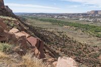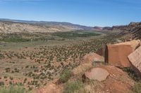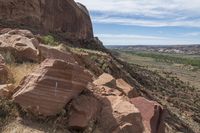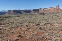 A stunning view of the red rock desert in Utah's Canyonlands National Park showcasing the majestic mountains, vast open spaces, and lush grass surfaces under a clear sky.