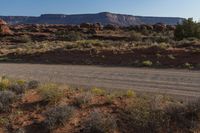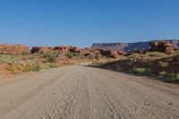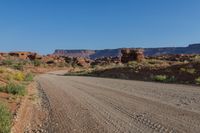 A breathtaking view of the red rock desert landscape in Utah, USA, with a dirt road winding through the grassy plains and woody vegetation. The clear blue sky complements the rugged mountain terrain and the Lock Hart Road leading into the distance.