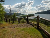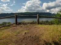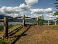 A beautiful landscape with lush vegetation and a wooden fence, offering a picturesque view of the highland terrain and surrounding woodlands. This serene park is the perfect place to relax and enjoy nature, with its rolling hills, peaceful lake, and abundant plant community. The open space and clear blue sky create a wonderful atmosphere for recreation and outdoor activities.