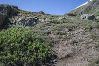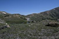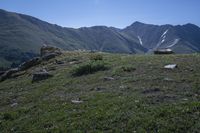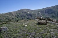 A breathtaking view of the highland mountain range in Colorado, USA, with clear sky and a serene lake reflecting the surrounding wilderness. The rocky cliffs and grassy surface provide a picturesque setting for recreational activities in nature.