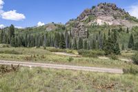Beautiful view of a mountainous landscape in Colorado, USA, with dirt roads winding through the forest and fields, surrounded by lush vegetation and towering cliffs on a sunny day.
