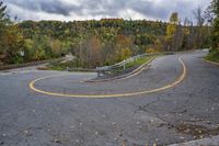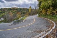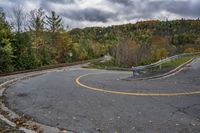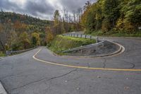 A picturesque mountain road winding through a lush autumn forest, surrounded by vibrant foliage and towering trees.