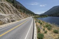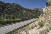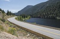 A breathtaking view of a mountain road in British Columbia, Canada. The road is surrounded by stunning natural landscapes and vegetation, with mountains towering in the background. The clear sky and sunlight add to the beauty of this picturesque scene.