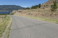 A winding asphalt road surrounded by evergreen trees and breathtaking mountain landscape in Kelowna, British Columbia, Canada.