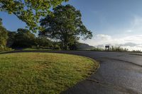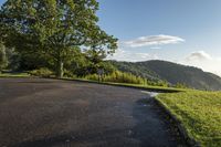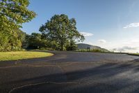 A low light dawn illuminates a tree-lined road in North Carolina, USA. The asphalt road curves through the lush forest, offering a scenic landscape with open space and green vegetation. The clear sky and sunshine add to the beauty of this recreational destination in the Appalachian region.