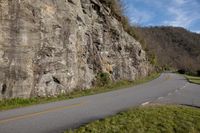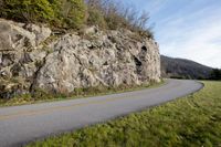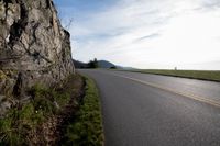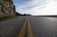 A picturesque mountain road winding through a rural landscape, with lush green grass on the sides and tall trees lining the way. The asphalt road surface stretches ahead, disappearing into the horizon, surrounded by majestic mountains and a clear blue sky with fluffy clouds.
