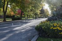 A lush suburban park in Toronto, Ontario, Canada, with beautiful green vegetation, deciduous trees, and a road surface surrounded by nature and sunlight. The park features outdoor furniture including benches for recreational purposes.
