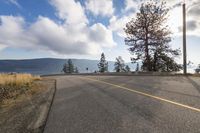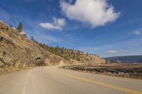 A picturesque coastal road winds through the stunning landscapes of British Columbia's Okanagan Valley, offering breathtaking views of the highland mountains, Okanagan Lake, and lush vegetation.