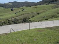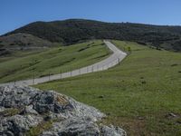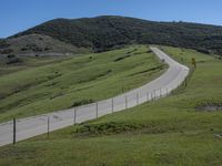 A picturesque road winding through the beautiful landscape of California, USA with mountains, grassy pastures, and clear blue sky.