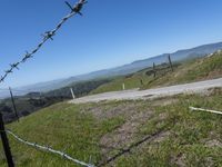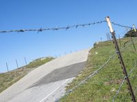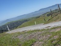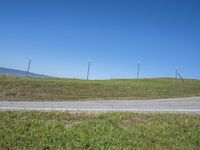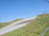 A low angle view of a winding road surrounded by lush green grass and tall trees in the beautiful landscape of California, USA.