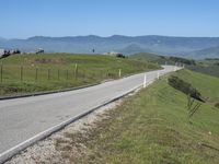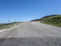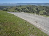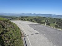 A picturesque road cutting through the low-lying landscape of California, USA, surrounded by mountains, lush grass, and clear skies on a sunny day.