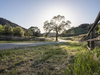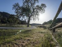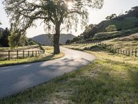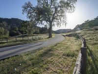 A beautiful road in California, USA, winding through low-lying highlands with lush green grass and vegetation, under the bright sunlight and clear sky.