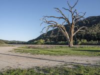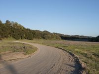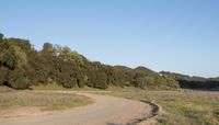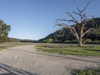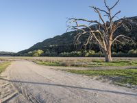 A low dirt road winding through the picturesque landscape of California, USA, surrounded by majestic mountains, lush grass, and trees.