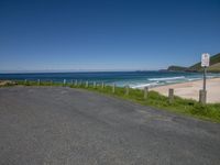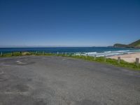 A road surface winds through a picturesque coastal landscape with a clear sky and open space
