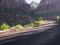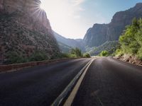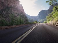 A low road stretches through the desert landscape of Colorado at dawn, with mountains in the background. The asphalt road leads into the wilderness, surrounded by lush greenery and clear skies. Sunlight casts long shadows on the road, revealing the beauty of the wilderness. This picturesque road is located in Zion National Park, near Mount Zion, offering stunning views of the highlands and valleys along the way.