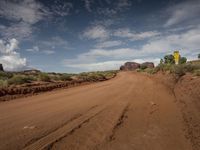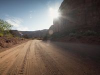 A rugged road winding through the desert landscape of Colorado, USA, with mountains in the background and a clear blue sky above.