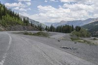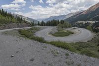 A picturesque road winds through the stunning landscape of Colorado's mountain range, surrounded by lush forests, grassy highlands, and towering cliffs. The asphalt road curves and switches back, offering breathtaking views of the elevated valley and the majestic alps in the distance. This scenic route is located near the charming town of Telluride, making it a perfect destination for nature lovers and road trip enthusiasts.