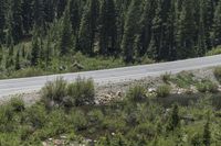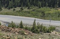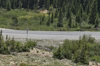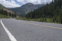 A straight road stretches through the picturesque highlands of Colorado, USA. The asphalt thoroughfare winds through the stunning mountain pass, surrounded by lush forests, rocky mountains, and vibrant yellow trees. The cloudy sky adds to the tranquil beauty of this natural environment.