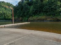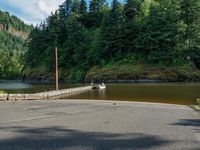 A beautiful asphalt road winds through a stunning highland landscape with mountains, forests, and a river in the background.