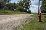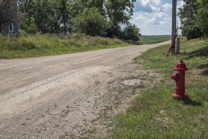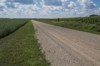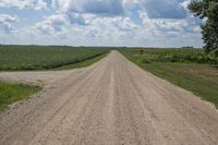 A beautiful road stretching through the rural landscape of Iowa, with a grass surface and surrounded by fields and farmland.