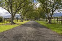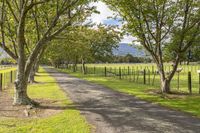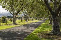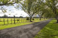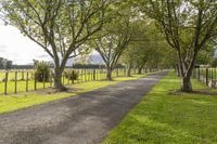 A straight road cutting through the green grass surface and woody plant vegetation in a rural landscape, under a clear sky with sunlight shining down. The gloomy grey sky adds a touch of drama.