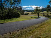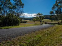A picturesque view of a road winding through the lush green fields of New South Wales, Australia on a sunny day. The road curves gently through the mountainous highlands, surrounded by vibrant vegetation and natural beauty. This serene landscape is located in the Sapphire Coast region near the towns of Bermagui and Wapengo.