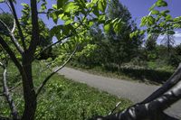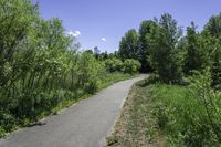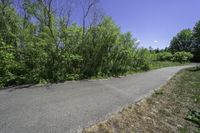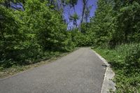 A straight road with lush green vegetation on both sides, leading towards the beautiful city of Toronto in Ontario, Canada. The clear blue sky and sunlight shining through the branches of trees create a serene and peaceful atmosphere.