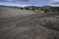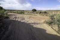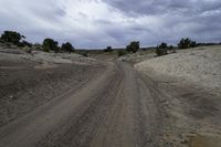 A picturesque road winding through the stunning red rock landscape of Utah's desert, with asphalt and dirt blending seamlessly into the surrounding nature. The road cuts through hills and mountains, offering breathtaking views of the San Rafael Swell and the rugged terrain. The S-curve road is flanked by rock walls, outcrops, and vegetation, showcasing the diverse formations and profiles of this canyonlands region. The road surface, covered with gravel and sand, bears witness to the erosion caused by the wind, creating unique Aeolian landforms. The high elevated ground provides a captivating view of the horizon, while trees and grass add a touch of green to the otherwise arid plain. This image captures the natural beauty and tranquility of this remote desert landscape.