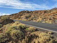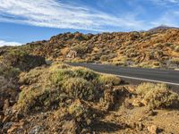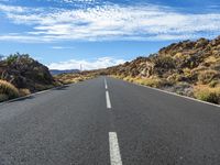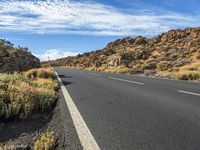 A straight road stretches across the beautiful highland landscape of Spain, surrounded by low mountains and lush vegetation. The clear blue sky and fluffy clouds create a picturesque scene in the European countryside of Tenerife, Canary Islands.