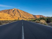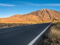 A picturesque road winds through the low-lying landscape of Tenerife, offering stunning views of the mountains, grassy plains, and lush vegetation of this rural region. The road surface, made of smooth asphalt, creates a contrasting element against the natural terrain. The clear blue sky, fluffy white clouds, and the hard shadows create a beautiful play of light and shadow. This breathtaking scene is captured in a highland area, showcasing the beauty of nature in this European destination.