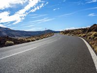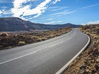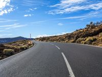 A picturesque asphalt road winding through the low landscape of Tenerife, Canary Islands, Spain. The road cuts through the mountainous terrain, surrounded by lush green grass and vibrant vegetation. The sunny day with clear blue skies adds to the natural beauty of this rural highland. As you drive straight down the road, you can see the coastal horizon in the distance. The road surface is smooth and well-maintained, making it an ideal thoroughfare for exploring the natural wonders of Tenerife's woody plant formations and bush-covered slopes. This image captures the essence of the stunning European landscape.