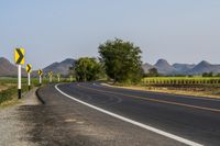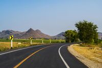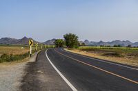 A picturesque road surrounded by mountains, fields, and trees in rural Thailand on a sunny day