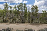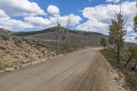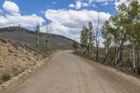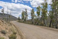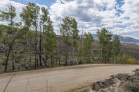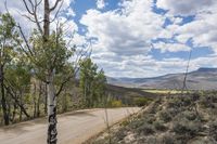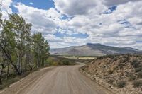 A winding dirt road surrounded by lush vegetation and towering mountains, creating a breathtaking landscape.