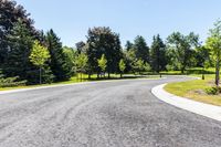 An empty road with asphalt pavement, lined with trees and grass, under a clear sky and sunlight in Toronto, Ontario, Canada.