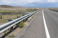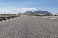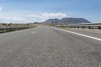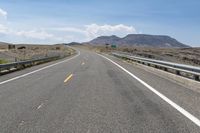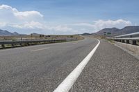 A breathtaking view of a winding mountain road in Colorado, USA. This picturesque landscape showcases the natural beauty of the highlands, with the road stretching into the distance. The asphalt road surface is lined with a yellow shoulder and guard rails for safety. The clouds overhead add to the overall scenic beauty of this nature-filled day.