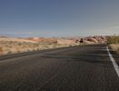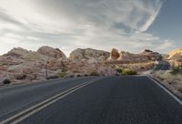 A stunning dawn view of a winding road cutting through the desert landscape of Colorado, USA, surrounded by towering mountains and rock formations. The asphalt highway leads into the vast wilderness, with dramatic clouds hovering above the badlands.