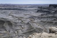 a valley of gray colored rock that resembles a desert land, with dirt, sand and some vegetation in the foreground