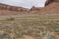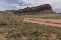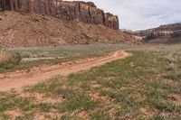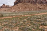 A beautiful view of a road cutting through Utah's desert landscape with red rock formations and mountains in the background, surrounded by grass and wild vegetation.