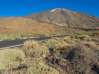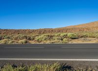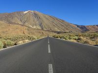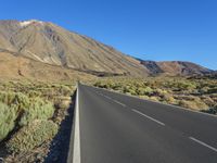 A low-angle view of a straight road cutting through the beautiful Spanish countryside, surrounded by lush green grass, trees, and mountains. This picturesque scene was captured on a sunny day in a rural area of Tenerife, one of the Canary Islands in Europe. The elevated terrain and clear blue sky add to the natural beauty of this national park.