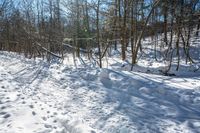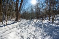 A straight road stretches through the snowy landscape of rural Ontario, Canada. The sun casts hard shadows on the road, creating a picturesque scene on a sunny day.