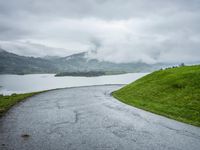 A stunning landscape of the Lake District in Switzerland, Europe. The road winds through the highlands, surrounded by lush green grass, trees, and vibrant autumn vegetation. Majestic mountains loom in the distance, reflecting in the calm and serene lake. The clouds overhead add depth to the picturesque scenery. This breathtaking overlook showcases the beauty of nature and water resources in this rural region.