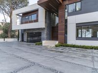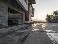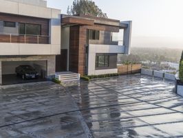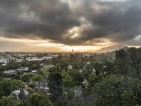 The dawn of a new day in Los Angeles, California, USA reveals the modern architecture of the city's residential area, including the villas, buildings, and parking garages, while the trees, clouds, and mountains in the horizon create a dramatic view of the urban landscape.