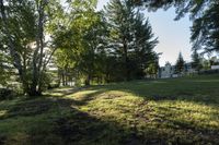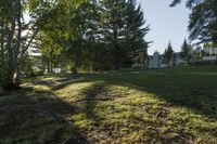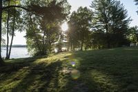 A breathtaking view of a residential area nestled in the lush forests and green grass of Canada. The picture captures the open space and natural beauty of this rural setting, with sunlight filtering through the vegetation and casting a tranquil shadow on the lake. The house is surrounded by a well-maintained lawn and a charming courtyard, creating a peaceful oasis. The image also showcases the majestic trees and woody plants that line the shore, providing shade and adding to the overall beauty of the scene.