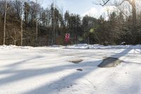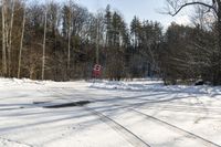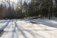 A beautiful winter landscape in Toronto, Canada. The asphalt road cuts through the forest, surrounded by snow-covered trees and branches. The clear sky and bright sunshine create a stunning view of the snowy terrain.