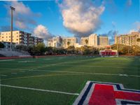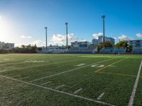 A view of a football field in Miami Beach, Florida, USA, at the break of day, showing the hard shadow of the early morning sun on the grass surface.