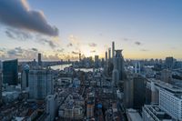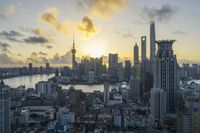 A stunning view of Shanghai's modern architecture at dawn, showcasing the city's high-rise skyscrapers and metropolitan area.