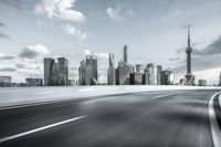 A breathtaking view of the modern architecture and skyscrapers in Shanghai, China, during dawn. The cityscape is illuminated by artificial light, with a motion blur effect on the road and street lights.
