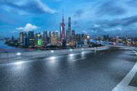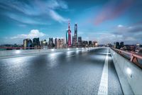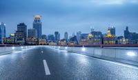 A stunning view of Shanghai's cityscape at night, showcasing the modern architecture and bustling urban life in this vibrant Chinese municipality. The city lights and skyscrapers create a captivating skyline, while the motion blur of cars on the highway and street lights add a sense of movement and energy to the scene.