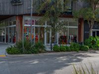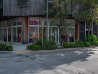 A hard shadow is cast on the asphalt road in front of store fronts in Miami Beach, Florida. The bright day brings out the vivid colors of the city and urban design in the foreground, with clouds in the sky.