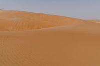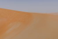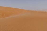 A rugged off-road track leads to a spectacular view of the sand dunes of the Liwa Desert in the United Arab Emirates, illuminated by the first rays of dawn and framed by a clear sky. The orange-hued landscape provides a unique view of the Aeolian landforms and the singing sands of the Sahara.